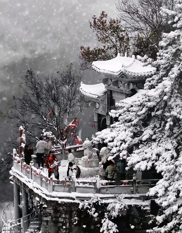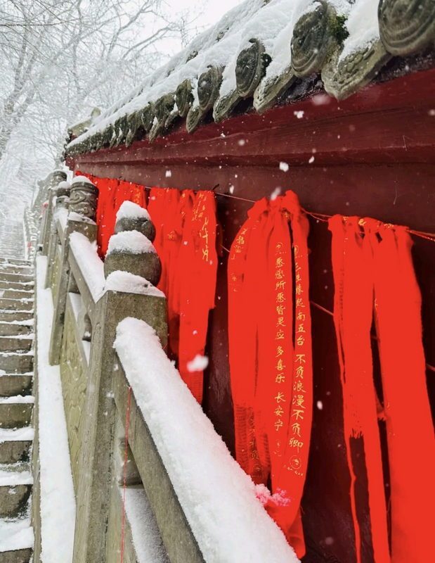瑤臺仙境的煙火氣息,當(dāng)夜幕降臨燈光亮起,南五臺又呈現(xiàn)出另一番迷人的景象:飛檐斗拱被勾勒出清晰的輪廓,暖黃色的燈光映照在雪地上,為這清冷的冬夜增添了幾分溫暖。